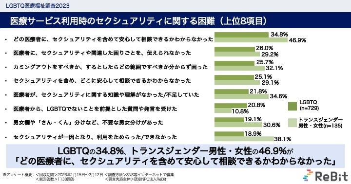 なお、過去10年に医療サービス等を利用した際に、LGBTQの66.1%、特にトランスジェンダー男性・女性は77.8%が、セクシュアリティに関連した困難を経験しています。