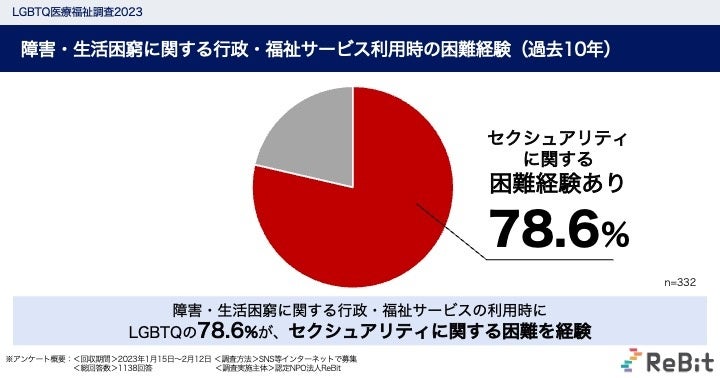 過去10年に、障害や生活困窮に関する行政・福祉サービス等を利用したLGBTQの78.6%が、利用時にセクシュアリティに関する困難を経験し、安全に行政・福祉サービスを利用できていません。