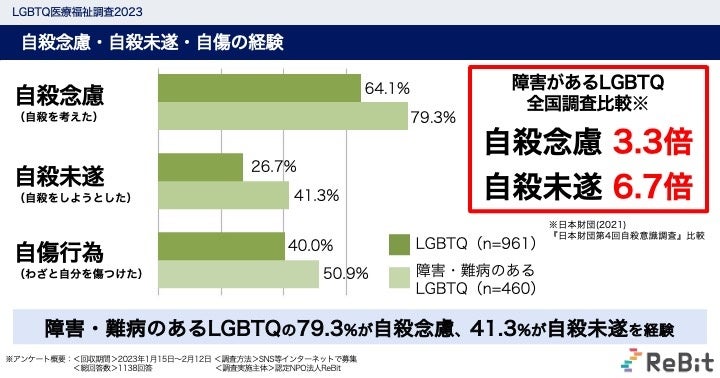特に障害・難病があるLGBTQは、79.3%が自殺念慮、41.3%が自殺未遂、50.9%が自傷行為を経験し、自殺におけるリスクはさらに深刻です。日本財団の『日本財団第 4 回自殺意識調査(2021)』と比較し、障害・難病のあるLGBTQの自殺念慮は3.3倍、自殺未遂経験は6.7倍高い状況にあります。