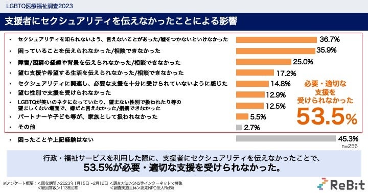一方で、53.5%が行政・福祉サービス等を利用した際に支援者にセクシュアリティを伝えなかったことで、必要・適切な支援を受けられなかったと回答。このことから、ハラスメントやアウティングへの恐れにより支援者にセクシュアリティに関連する情報を伝えられないことは、必要・適切な支援を阻む要因になっていると考えられます。