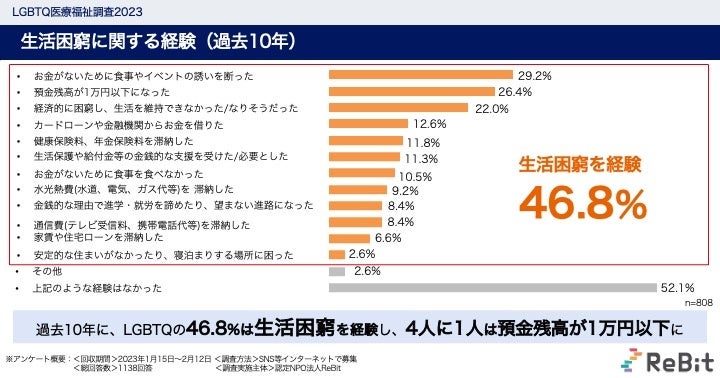 過去10年に、LGBTQの半数(46.8%)は生活困窮を経験したと回答し、4人に1人(26.4%)は「預金残高が1万円以下になった」経験があります。また、「健康保険料、年金保険料を滞納した(11.8%)」「生活保護や給付金等の金銭的な支援を受けた/必要とした(11.3%)」と最低限度の生活を維持することが困難になった経験も挙がりました。