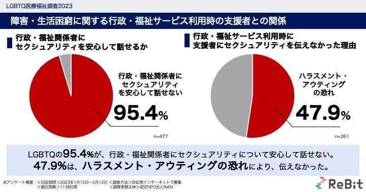 行政・福祉関係者にセクシュアリティについて安心して話せないLGBTQの割合は95.4%と、高い状況です。また、障害・生活困窮に関する行政・福祉サービス等を利用した際にセクシュアリティについて支援者に伝えなかった理由として、47.9%がハラスメントやアウティング(第三者へセクシュアリティを勝手に暴露されること)への恐れを挙げています。