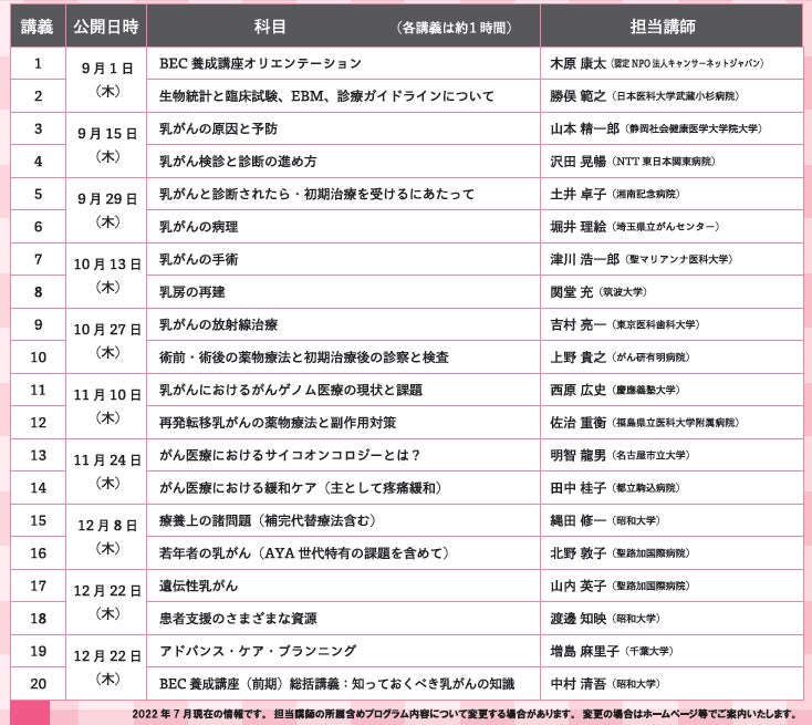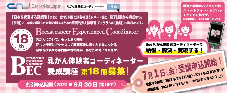 がん患者・家族主体のがん医療の普及・啓発を⽬指す認定NPO法⼈キャンサーネットジャパン(東京都⽂京区 理事⻑ 岩瀬 哲)は、乳がん医療について科学的根拠に基づいた正しい知識を⾝につけたいと考えている⽅に向け、9月開講「第18期 乳がん体験者コーディネーター(BEC)養成講座」の受講申込を7月1日に開始いたします。