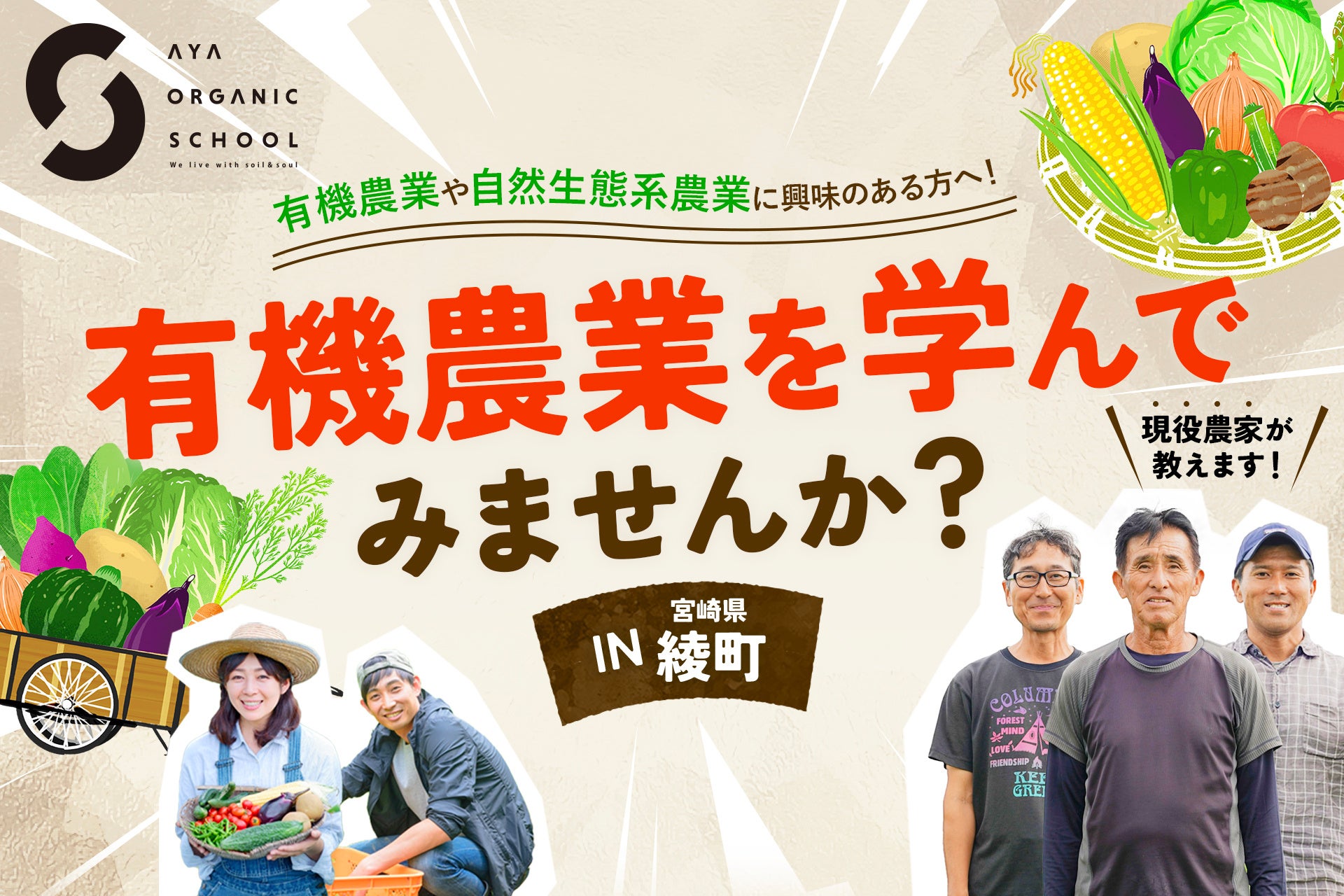本事業は、綾町で長年にわたり農業経営をしているベテラン農家や、約半世紀の歴史ある綾町の自然生態系農業を体系的に学び、自立した有機農家の創出および有機JAS認証農家の拡大の場となることを目指します。