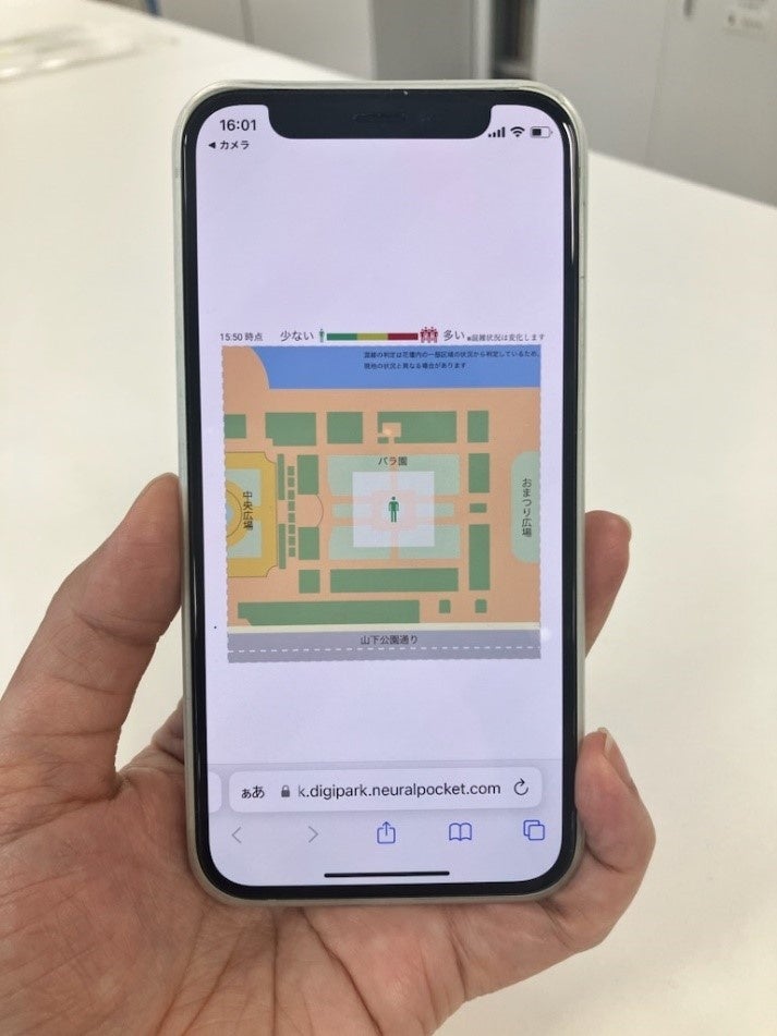 山下公園「未来のバラ園」に設置した2台のAIカメラ※1 により、園内の利用人数等を把握し、そのデータを基にした混雑状況※2 をWebページに表示します。