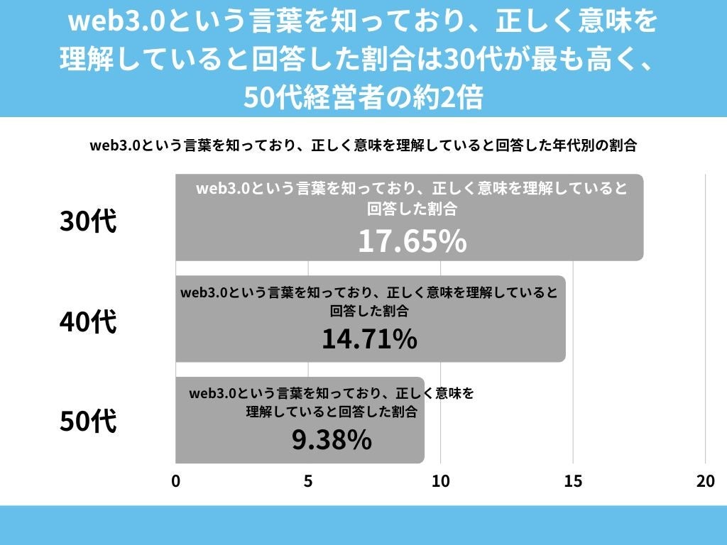 【web3.0という言葉を知っており、正しく意味を理解していると回答した割合は30代が最も高く、50代経営者の約2倍】