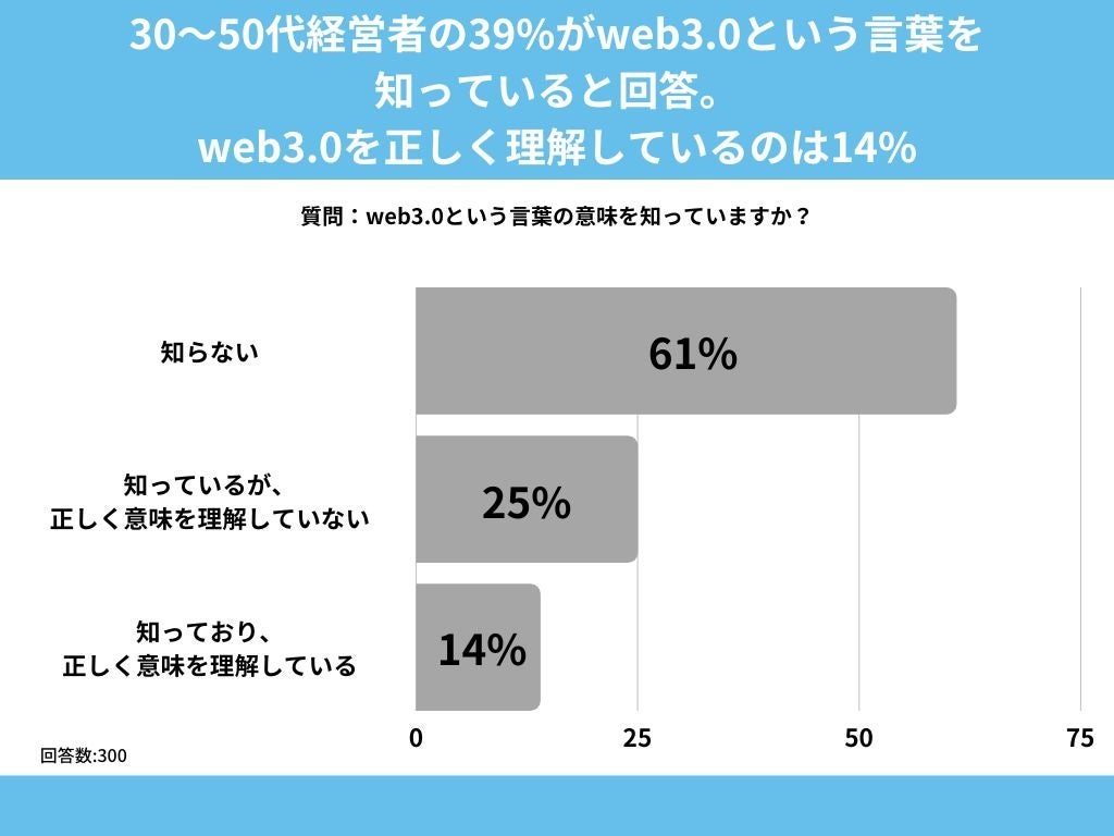 30代〜50代の男女を対象とした「web3.0という言葉の意味を知っていますか?」というアンケートで最も多かった回答は「知らない」で61%でした。