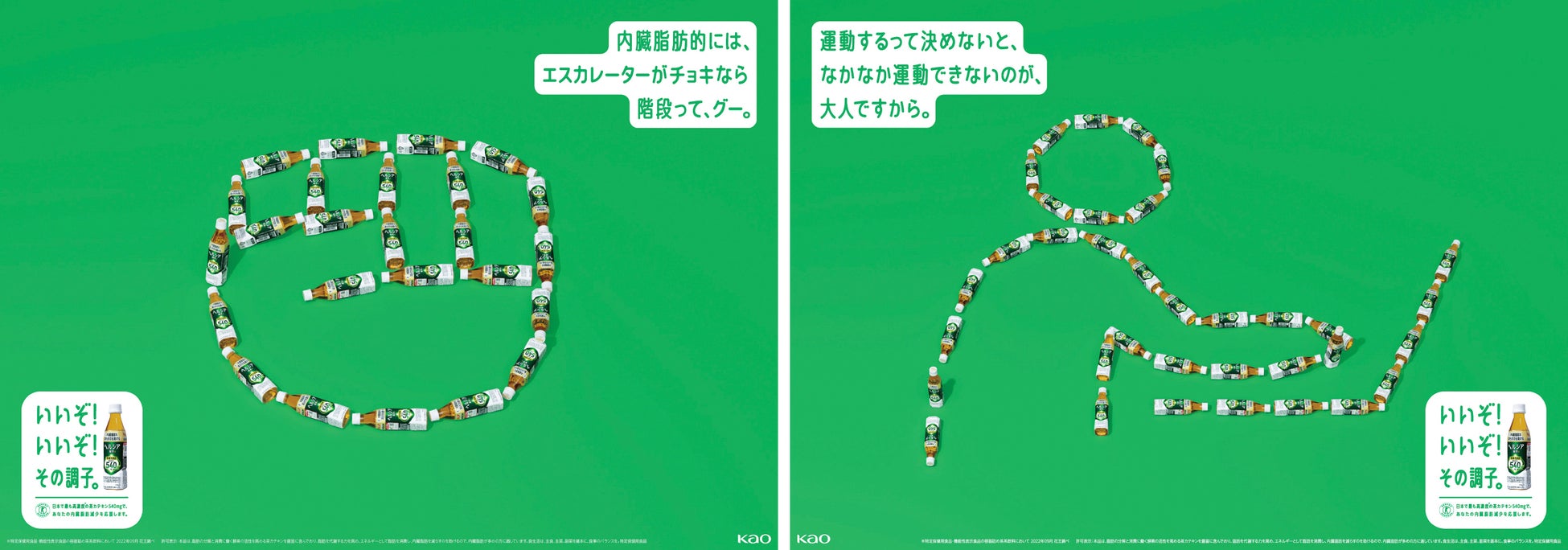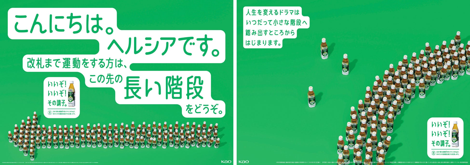 ヘルシア緑茶は、体脂肪減少を助けるお茶として2003年に発売されました。以来、名前の由来である“ヘルシーをアシストする”の通り、ブランド「ヘルシア」は内臓脂肪をはじめとした健康の悩みに寄り添い、多くの方をサポートしてきた実績を持ちます。そんなヘルシアが発売20周年を迎えるにあたり、より多くの方に日常生活の中でささやかな健康行動を継続する大切さを知っていただくべく、東京・都営大江戸線六本木駅の階段、大阪・阪急大阪梅田駅のムービングウォークに、サステナブル・エクササイズを楽しんでいただくための、様々な応援メッセージ広告を掲出します。