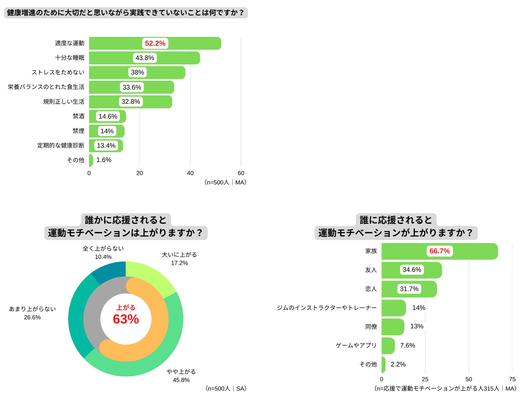調査では、半数を越える人が「健康増進のために大切だと思いながら実践できていないこと」という質問に「適度な運動」と回答。「誰かに応援されると運動モチベーションが上がるか」という質問には63%の方が上がると答え、その対象は「家族からの応援」が66.7%で1位。続いて「友人から」「恋人から」という回答が得られました。