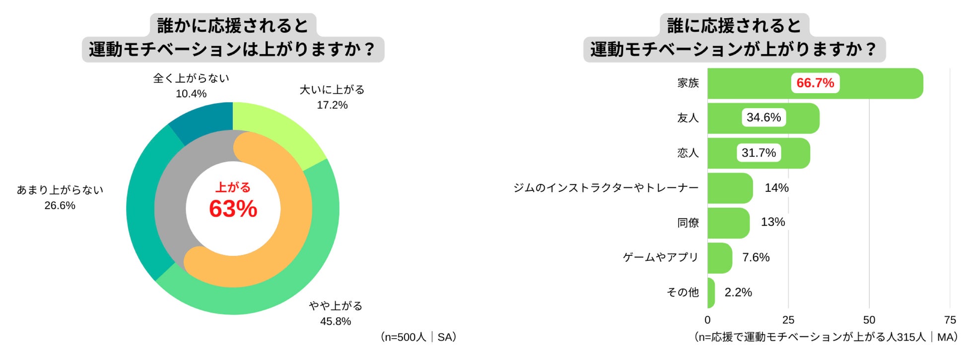 多くの人が運動を重視している中、63%の人が誰かに応援されると運動モチベーションが上がると回答。誰に応援されると運動モチベーションが上がるかの問いに対しては、1位「家族」66.7%、2位「友人」34.6%、3位「恋人」31.7%という結果になりました。