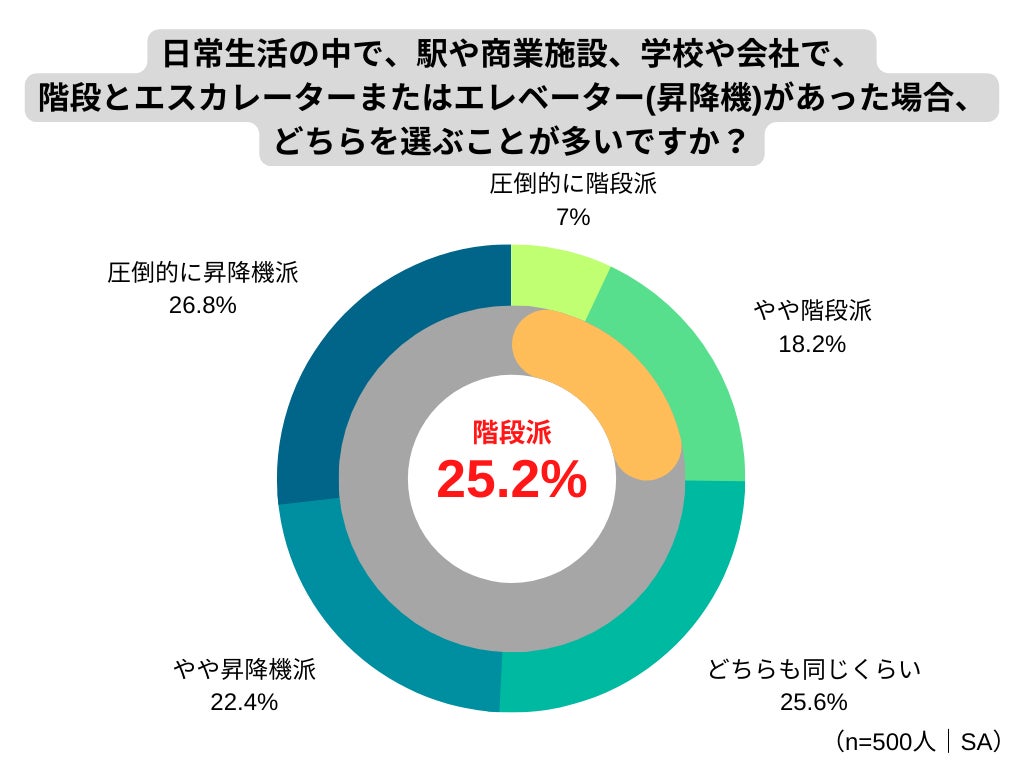 ・階段 or 昇降機(エスカレーターやエレベーター)のどちらを主に日常利用しているか、階段派は25.2%。