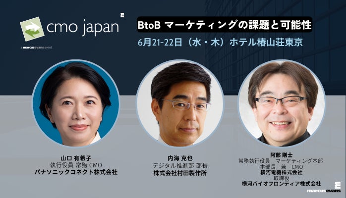 マーカス・エバンズ・イベント・ジャパン・リミテッド(本社:英国/日本支社代表:雪下 大輔、以下「マーカスエバンズ」)のマーケティング部門のビジネスサミット『CMO Japan Summit 2023』のインターラクティブセッションが決定いたしました。本セッションではパナソニックコネクト株式会社 山口 有希子氏、株式会社村田製作所 内海 克也氏、横河電機株式会社 阿部 剛士氏をお迎えし、BtoBマーケティングの課題と可能性についてご討議させていただきます。