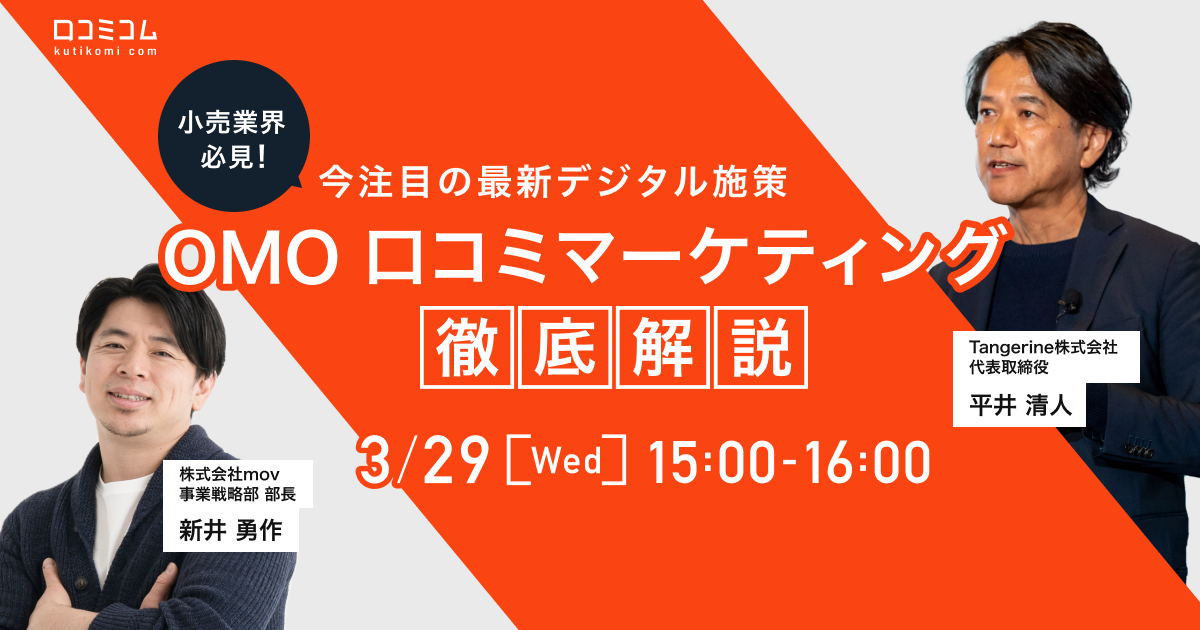 本セミナーには、OMOツール「Store360 UX」を提供するTangerine株式会社 代表取締役 平井 清人氏と、弊社mov 事業戦略部部長 新井 勇作が登壇。コロナ禍を経て小売業界で注目を集める最新施策「OMO」や「口コミマーケティング」について解説いただくセミナーを開催します。OMO、口コミマーケティングについて基礎から解説してほしいといった方にオススメの内容となっております。