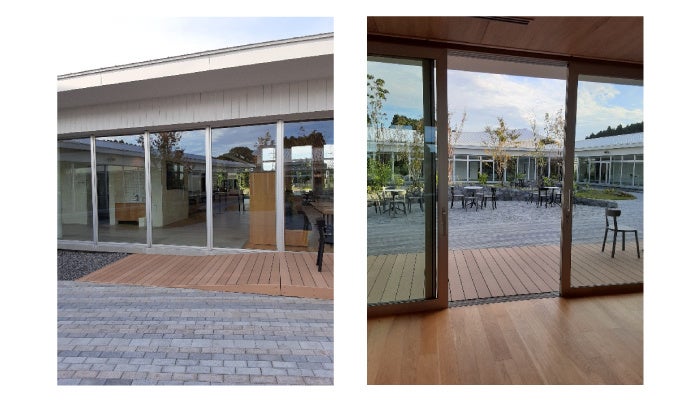 地域の皆様にも開放しているカフェテリアは、間仕切りや段差のない開放的な空間となっており、中庭へ通じるテラスは、車イスでも自由に出入り可能なスロープを設けています。