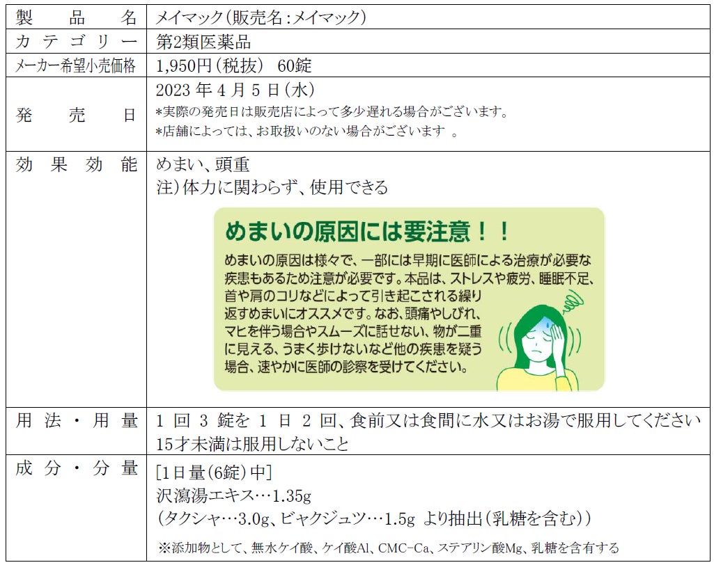 小林製薬はこの度、沢瀉湯を採用し、めまいにアプローチする市販の医薬品「メイマック」を発売いたします。当製品は、めまいや頭重(頭の重だるさ)を感じている人であれば、体質を気にせず使用できる、平衡機能を正常化してめまいを改善する漢方薬です。