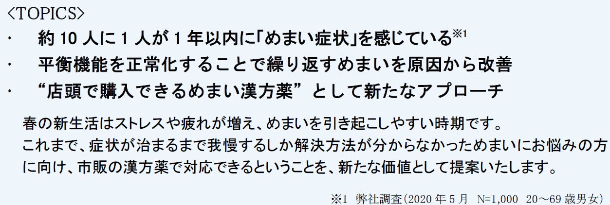 「めまい」の症状を放置することなく、「店頭で購入できるめまい漢方薬」という新しいアプローチで、生活者様のお悩みをサポートしてまいります。