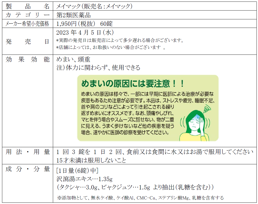 小林製薬はこの度、沢瀉湯を採用し、めまいにアプローチする市販の医薬品「メイマック」を発売いたします。当製品は、めまいや頭重(頭の重だるさ)を感じている人であれば、体質を気にせず使用できる、平衡機能を正常化してめまいを改善する漢方薬です。