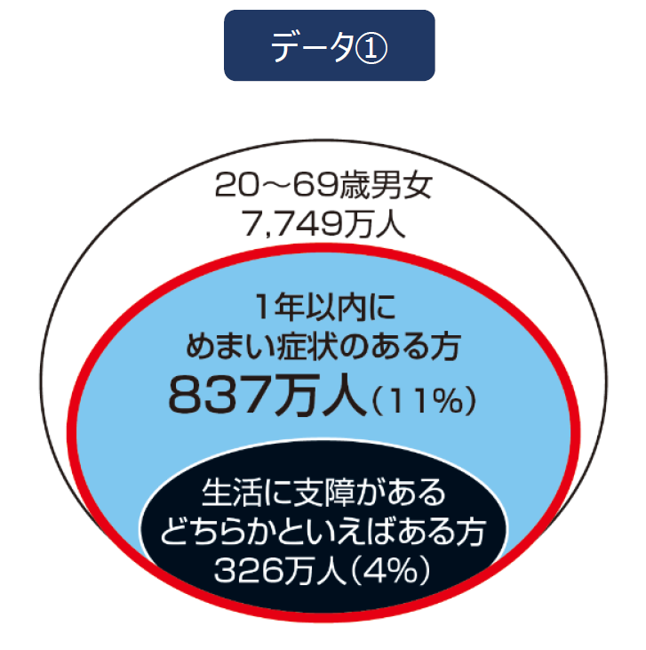 弊社調査によると、20~69歳男女のうち、1年以内に「めまい」症状を感じている人は837万人、約10人に1人に上ることが分かりました。(データ①)※1