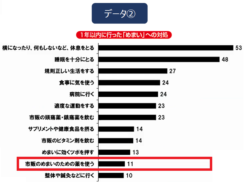 また、1年以内に行った「めまい」への対処では、「市販のめまいのための薬を使う」という人が11%と低いことがわかりました(データ②)※2
