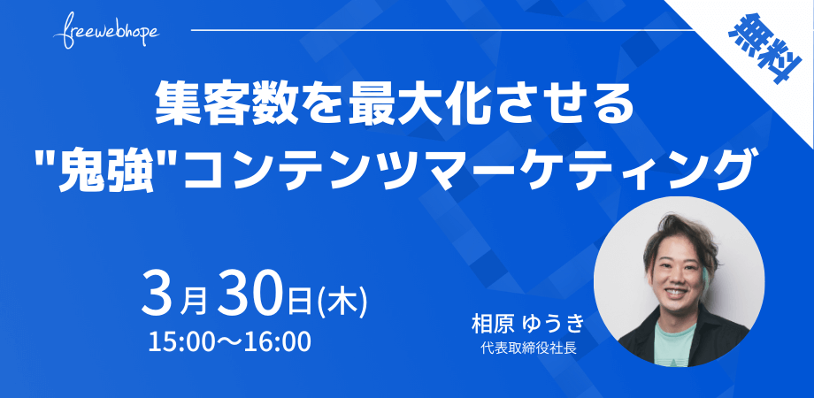 株式会社free web hope(本社:東京都中央区、代表取締役:相原ゆうき)は、無料のオンラインセミナー「集客数を最大化させる”鬼強”コンテンツマーケティング」を3月30日(木)に開催いたします。(お申込みフォーム:https://share.hsforms.com/1GUcUZL7RTAygLe3If_yQhA5fwo5)