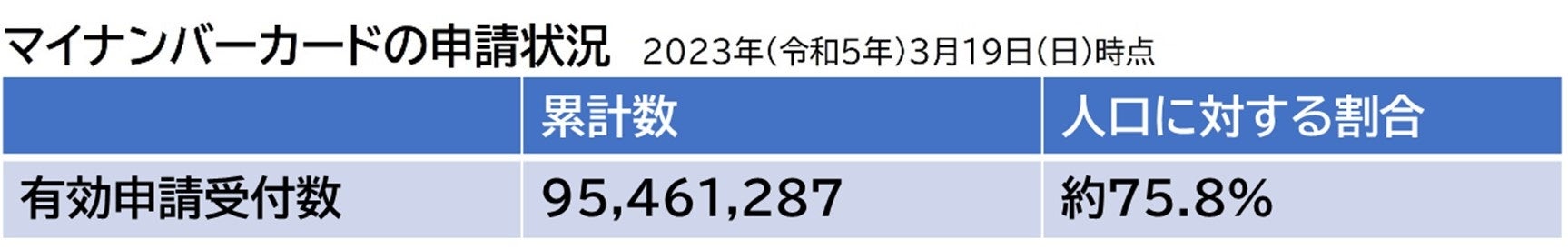 マイナンバーカードは対面でもオンラインでも安全・確実な本人確認ができるデジタル社会の基盤となるツールです。令和5年3月19日(日)時点で、マイナンバーカードの有効申請受付数は約9,546万件となり、人口に対する割合※が75%を超えました。これは、顔写真付きの本人確認書類として最も普及している運転免許証の令和3年末の保有者数である約8,190万人を上回る数になっています。