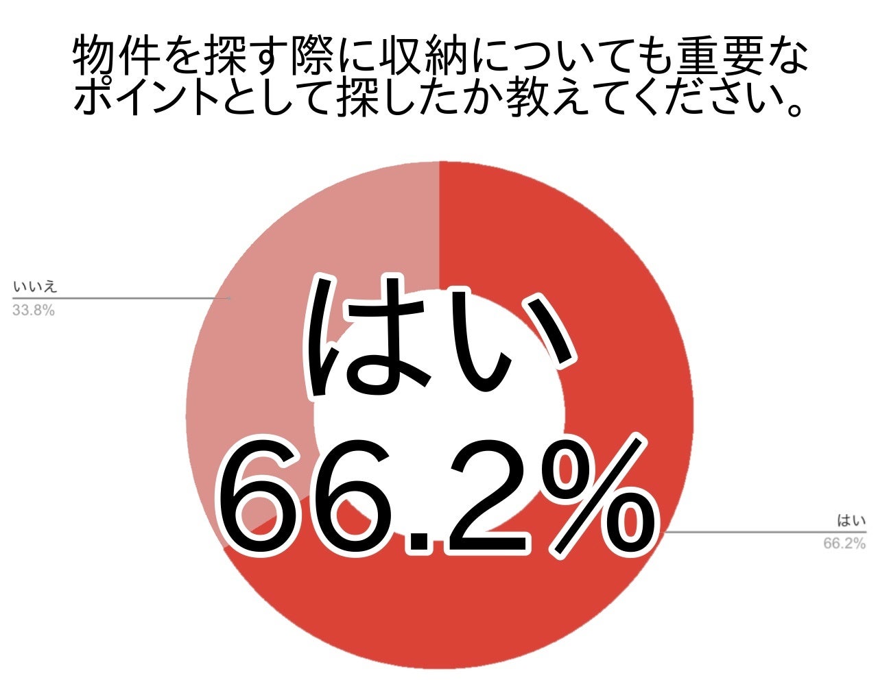 今回のアンケートでは都内で物件を探す際に収納についても重要なポイントとして探したという方は66.2%でした。