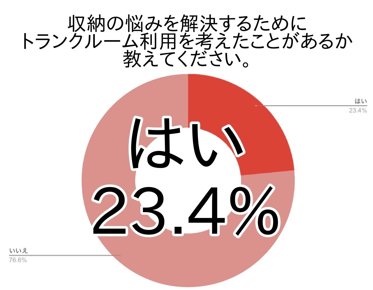 アンケートでは、23.4%の方がトランクルームの利用を考えたことがあると答えました。約4人に1人が、収納スペースの悩みを解決するためにトランクルームの利用を検討したことになります。