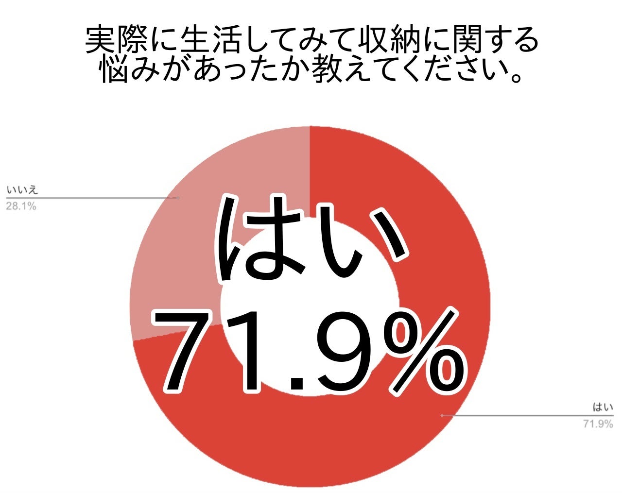 アンケートでは実際に生活してみて収納に関する悩みがあったと答えた方は71.9%でした。具体的な悩みについても尋ねました。