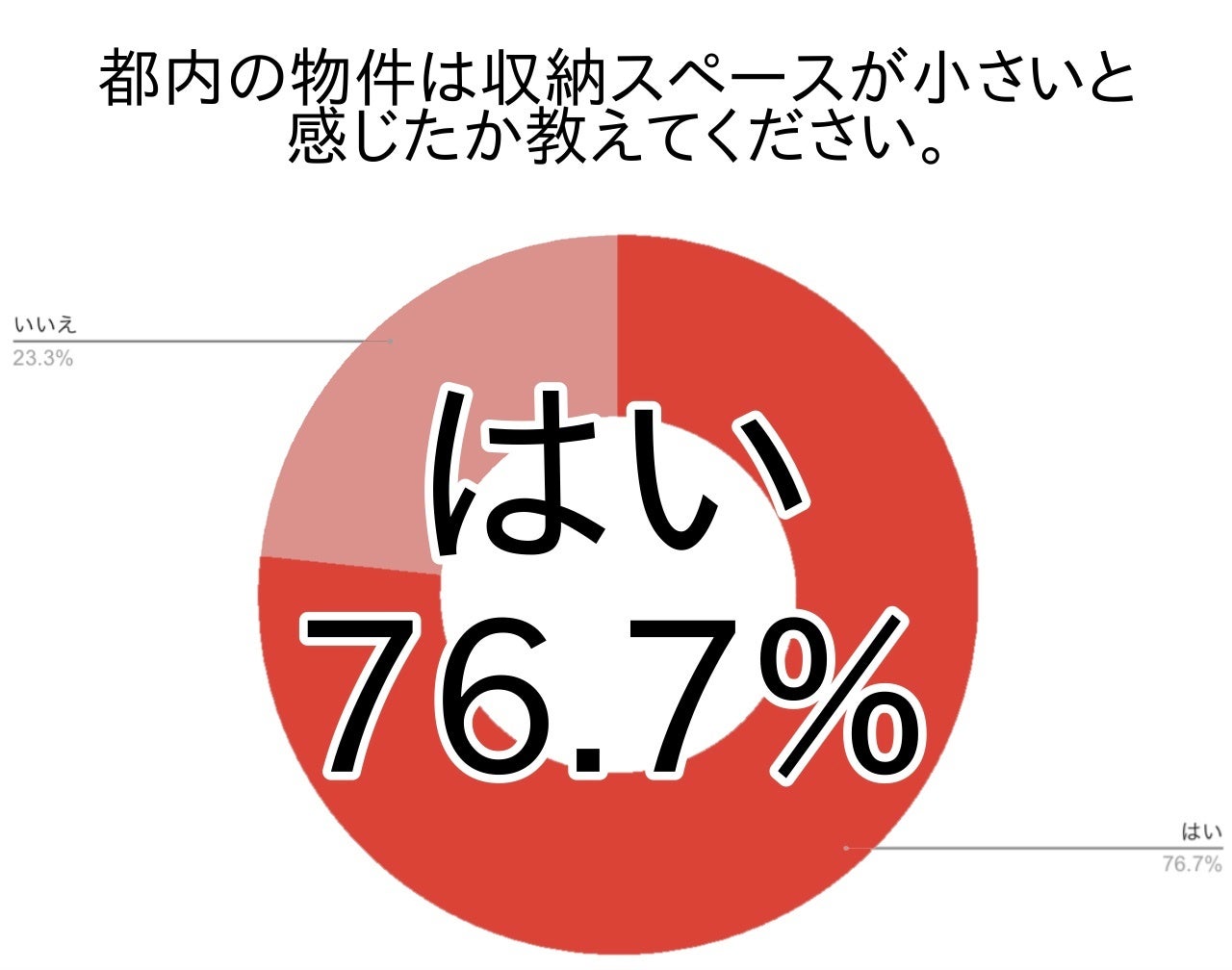 都内の物件は収納スペースが小さいと感じた方は8割弱(76.7%)でした。