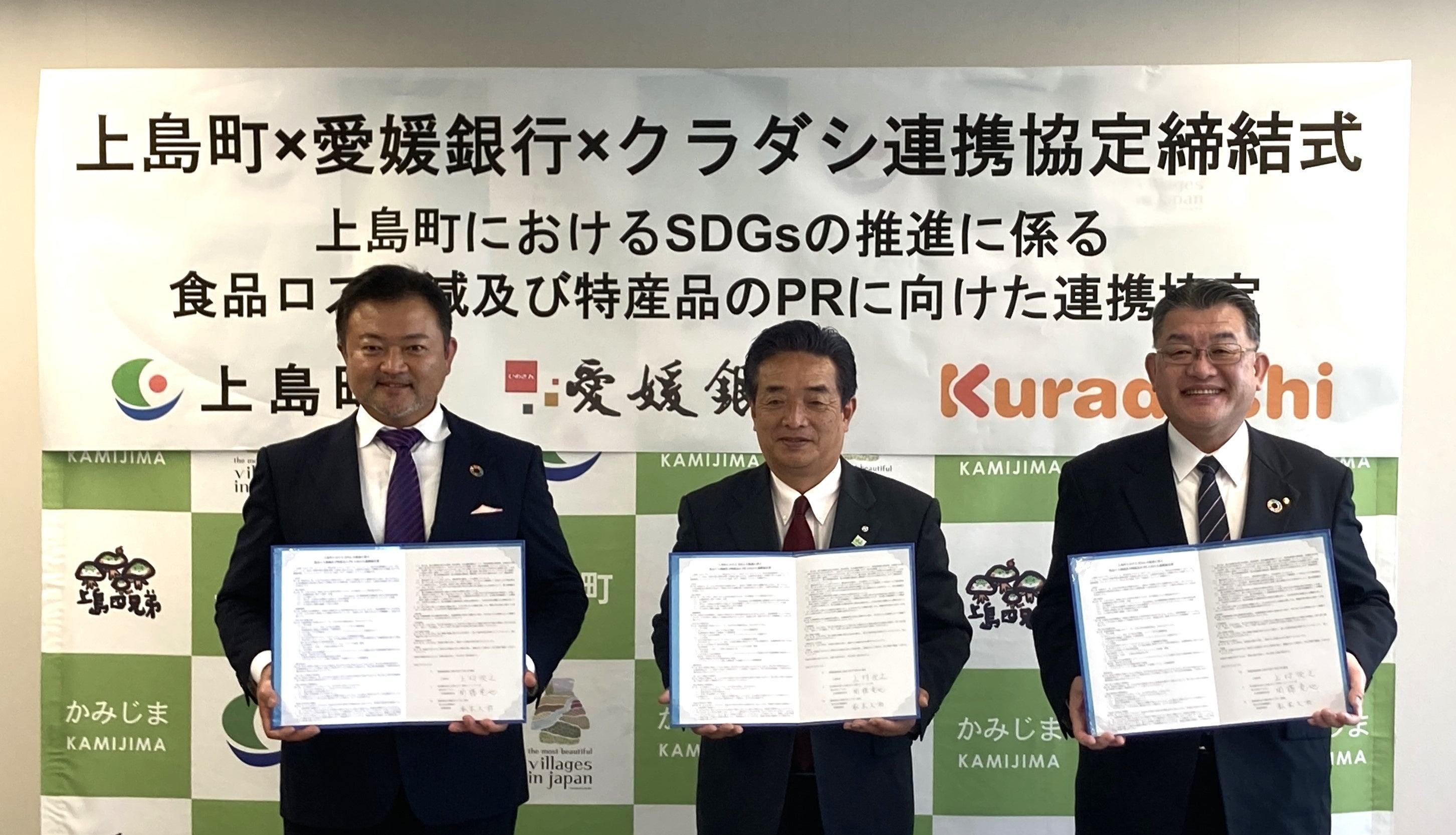愛媛銀行とクラダシは愛媛県内各地域のさらなる活性化ならびに一次産業支援を目指し、取り組みを進めています。このたび、取り組みの一環として上島町の産業・観光振興を目的に、上島町、愛媛銀行、クラダシの3者が連携協定を締結する運びとなりました。
