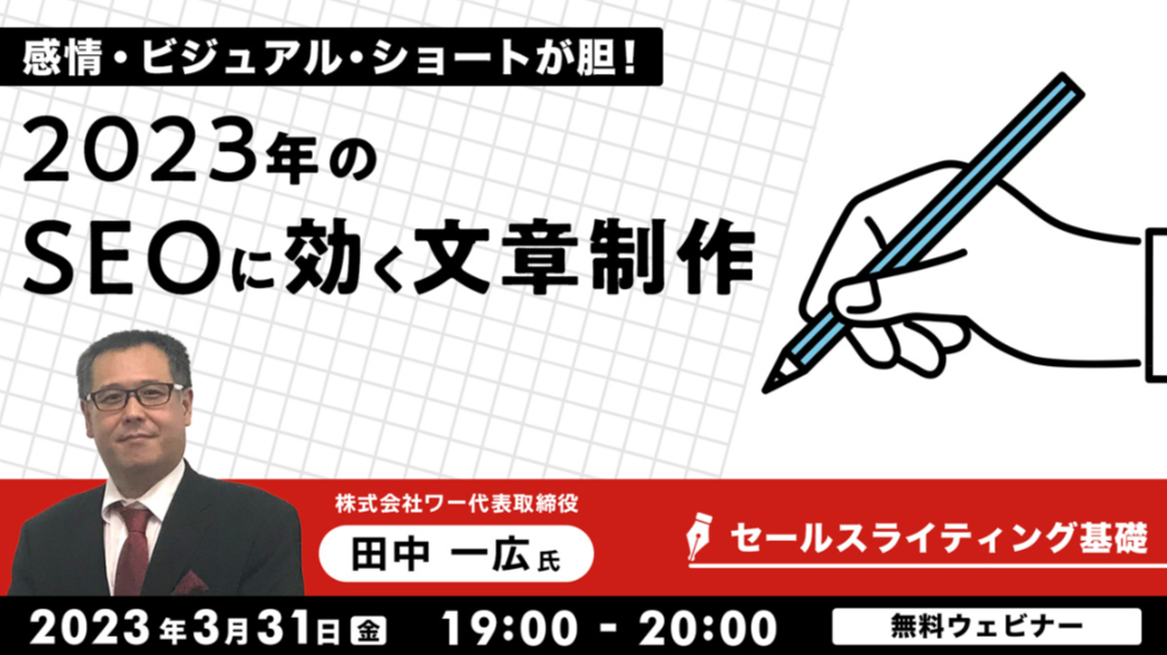 今回のセミナーでは、株式会社ワー 代表取締役の田中一広氏にご登壇いただき、検索エンジンの仕組みが日々進化する中で、「そもそもどのような構成でコンテンツを作るか?」という点を踏まえながら、上位表示を狙うSEOライティングについて解説していただきます。ライターの方はもちろんのこと、SNSのご担当者やWebディレクター、マーケターの方など、“売れる文章術”を学びたい方におすすめです。