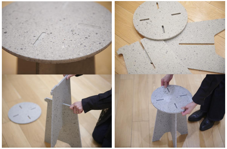 リサイクルボード「PANECO®(パネコ)」を使用した本スツールは、規格サイズのボードに対しロスの無い取り都合を考慮した形状で強度をも考慮した設計をしました。また、3つのパーツからなるデザインは組み立て式にすることで輸送時の積載効率の上昇に寄与し、店舗で簡単に組み立てることが可能です。GLRの店舗ではフィッティングルームや店内で、主にお客様の荷物置き台として使用を目的としています。