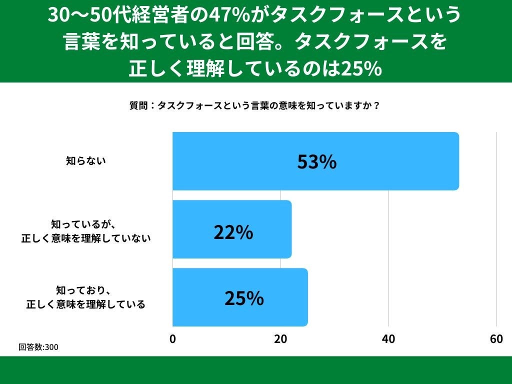 30代〜50代の男女を対象とした「タスクフォースという言葉の意味を知っていますか?」というアンケートで最も多かった回答は「知らない」で53%でした。