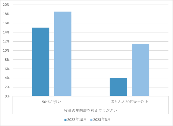 また、2022年10月の300社突破時に全体の18%であった「役員の年齢層」に関する50代が多い」「ほとんど50台後半以上」の回答が、30%に増加しており、これまでは若い経営者層が積極的にサステナビリティを意識している傾向にあったものが、年齢に関わらず問題意識とそれに取り組む意欲が広がりをみせています。