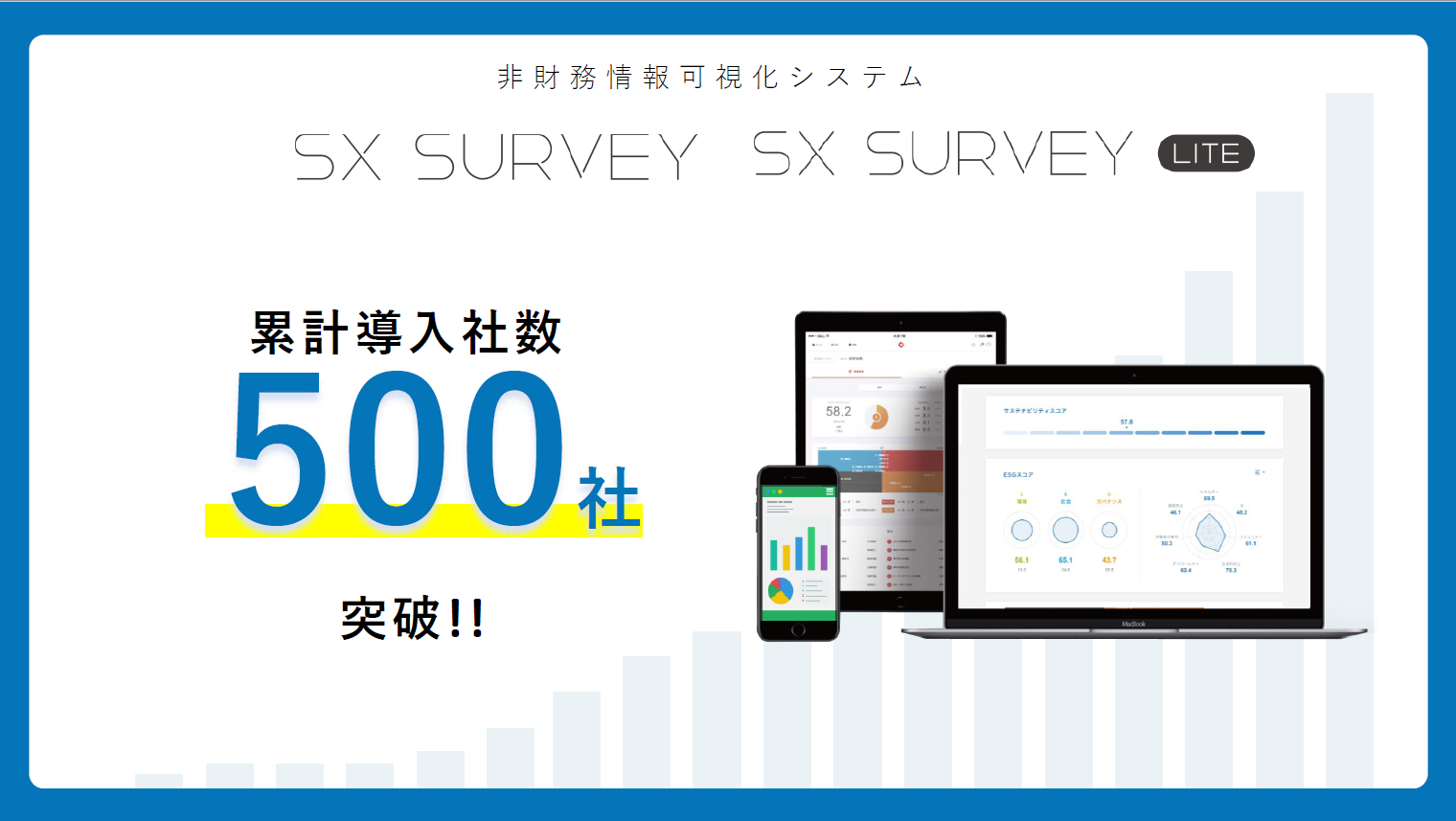 非財務情報可視化サービス「SXサーベイ」及び「SXサーベイLITE」の合計利用社数が、2022年1月のSXサーベイSaaS版のサービス開始以来、500社を突破しました。