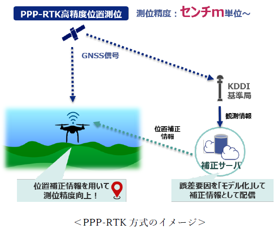 ドローンにはKDDIが提供するPPP-RTK方式の高精度位置測位サービス(注3)を活用しました。PPP-RTK方式は、PPP方式のカバー範囲の広さとRTK方式の測位精度の高さの両者のメリットを併せ持ち、モビリティ性を高めた新しい高精度位置測位の方式です。PPP-RTK方式を活用することで平均してセンチメートル単位でドローンの位置を把握することが可能となり、自動運転車への着陸を実現しました。