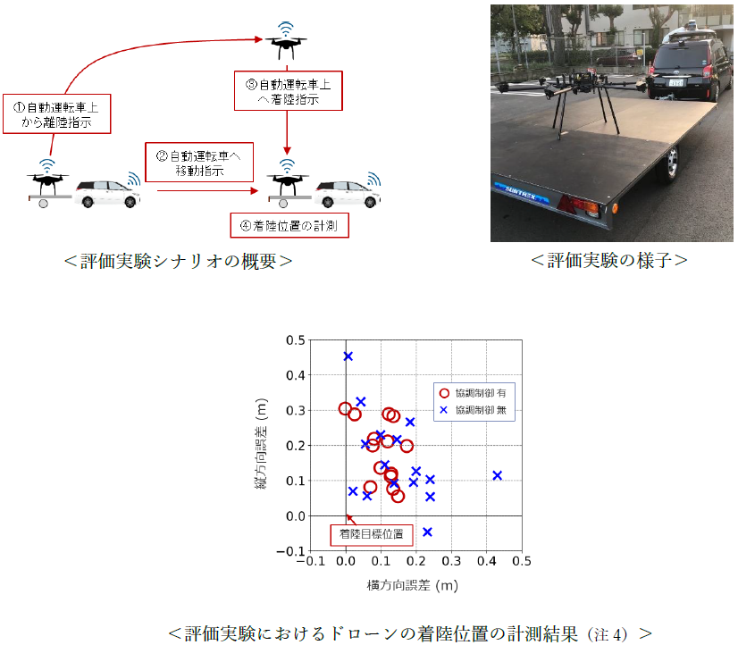 (注4)着陸位置の誤差要因として、位置測位誤差の他に、ドローンの機体制御誤差や協調制御プラットフォームによる着陸位置の計算誤差が含まれます。