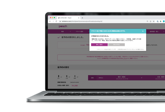 Peachでは、航空券以外の付帯収入を増やすため、化粧品や飲料メーカーの商品の飛行機内サンプリングや、搭乗券を広告スペースとして販売するなどさまざまな取り組みを進めていました。その一環として、航空券の購入に関する顧客のファーストパーティデータを活用した収益化を進めるべく、Peachが運営する航空券販売サイトにRoktのソリューションを導入し、2020年12月から運用を開始しました。