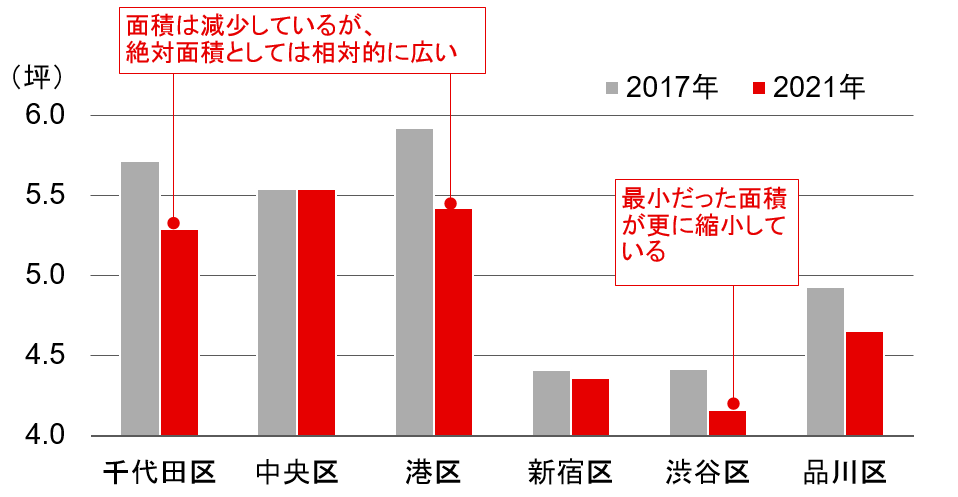 1人当たり面積の小さい渋谷区は、増床・拡張需要が発生しやすい地合いか