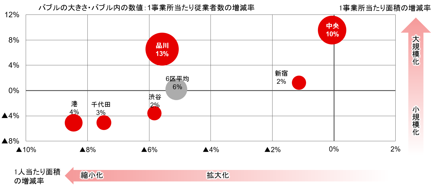 (注) 事業所面積は延床面積ベースのため、一般的な目安とされる1人当たりオフィス面積(3坪前後)とは異なる。千代田区や港区は1人当たり面積が減少しているが、絶対面積は広いため、スペースの不足感は相対的に小さいと思われる。
