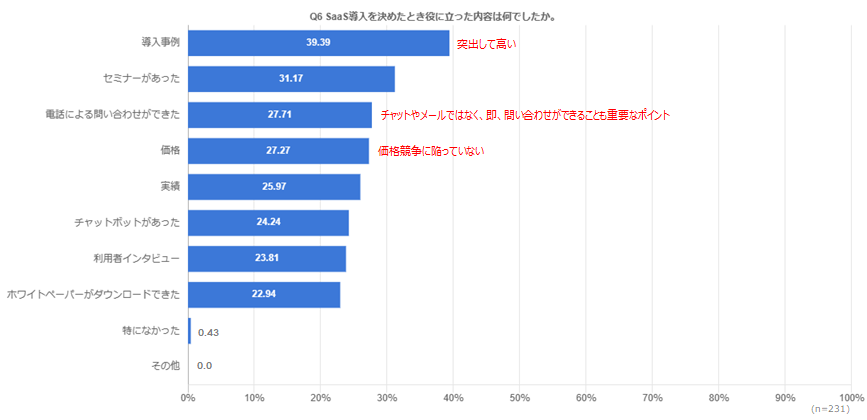 SaaS導入を決めたとき役に立った内容を聞いたところ、「導入事例」(39.4%)が最も高く、「セミナーがあった」(31.2%)とともに、具体的な活用例がわかることが重視されており、「価格」(27.3%)を上回った結果でした。