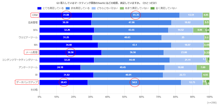 また、「とても満足している」のポイントが最も高いのは「メール配信」(36.6%)で、操作が分かりやすく、業務効率化を図れる等、利便性を感じやすいツールの満足度が高いことが見て取れます。