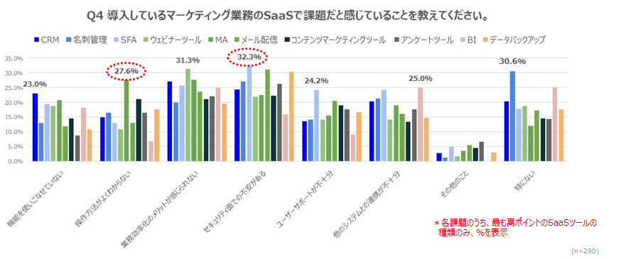 導入しているマーケティング業務のSaaSで、課題だと感じていることを聞いたところ、課題のポイントが最も高いのは「【SFA】のセキュリティ面での不安」(32.3%)、次いで、「【ウェビナーツール】の業務効率化のメリットが感じられない」(31.3%)という結果になりました。