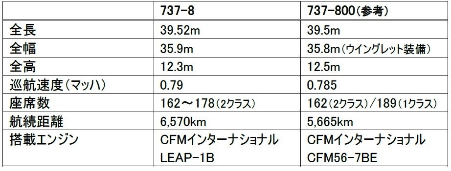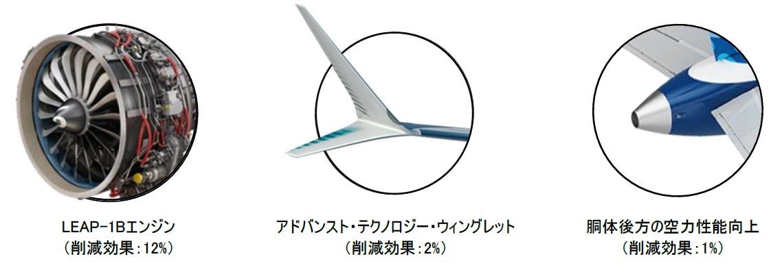 今回導入を決めたボーイング737-8型機は、737 MAXシリーズの機材の1つであり、燃費の向上したCFMインターナショナル社製の最新エンジンであるLEAP-1Bの搭載に加えて、最新鋭の翼端(アドバンスト・テクノロジー・ウィングレット)などにより、ボーイング737-800型と比較して燃料消費量およびCO2排出量約15%の削減が見込まれ、優れた経済性を有しています。