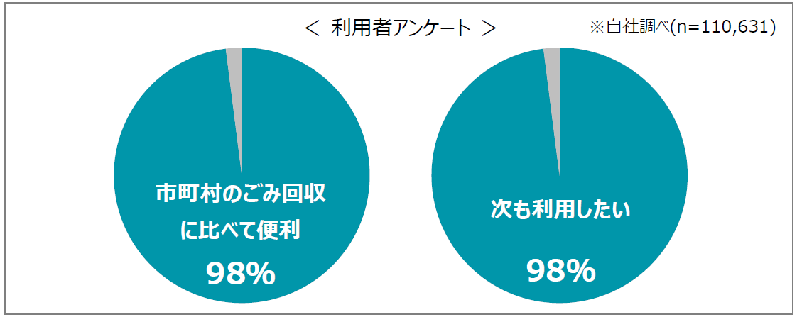 利用者アンケートでも98%が「市町村のごみ回収に比べて便利」、98%が「次も利用したい」と回答し、満足度の高いサービスとして評価をいただいています。
