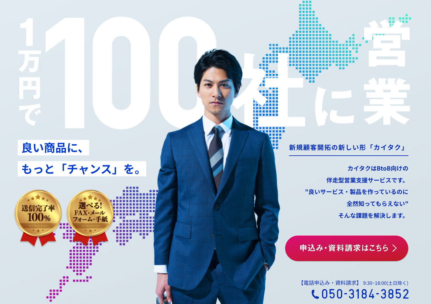 「カイタク」では、フォーム、テレアポ、手紙、FAX、郵送DMなど、幅広いチャネルで営業活動をサポートし、自社開発のITツールで営業活動の効率化を図ります。