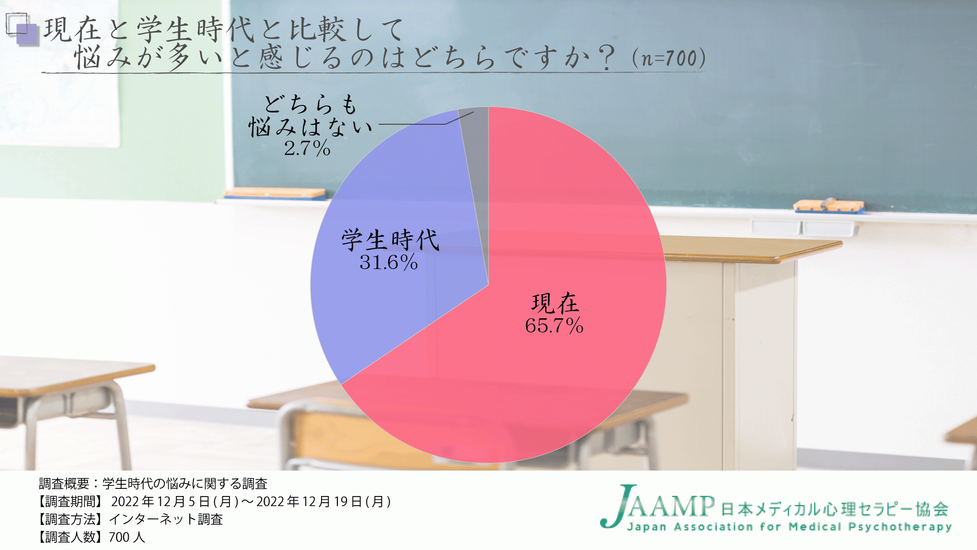今回の調査では、「現在」の方が悩みを抱えることが多いと回答した人が65.7%であった一方、「学生時代」と回答した人は31.6%という結果になりました。