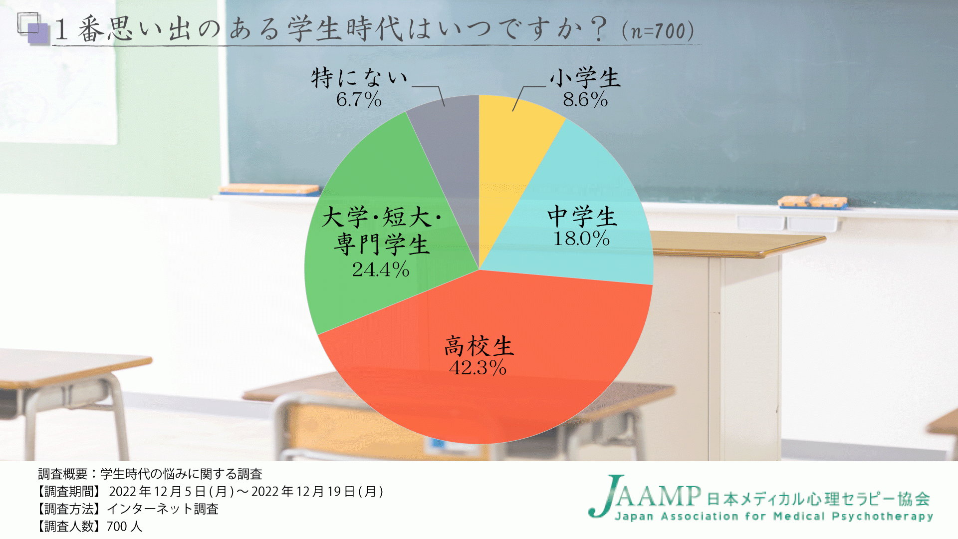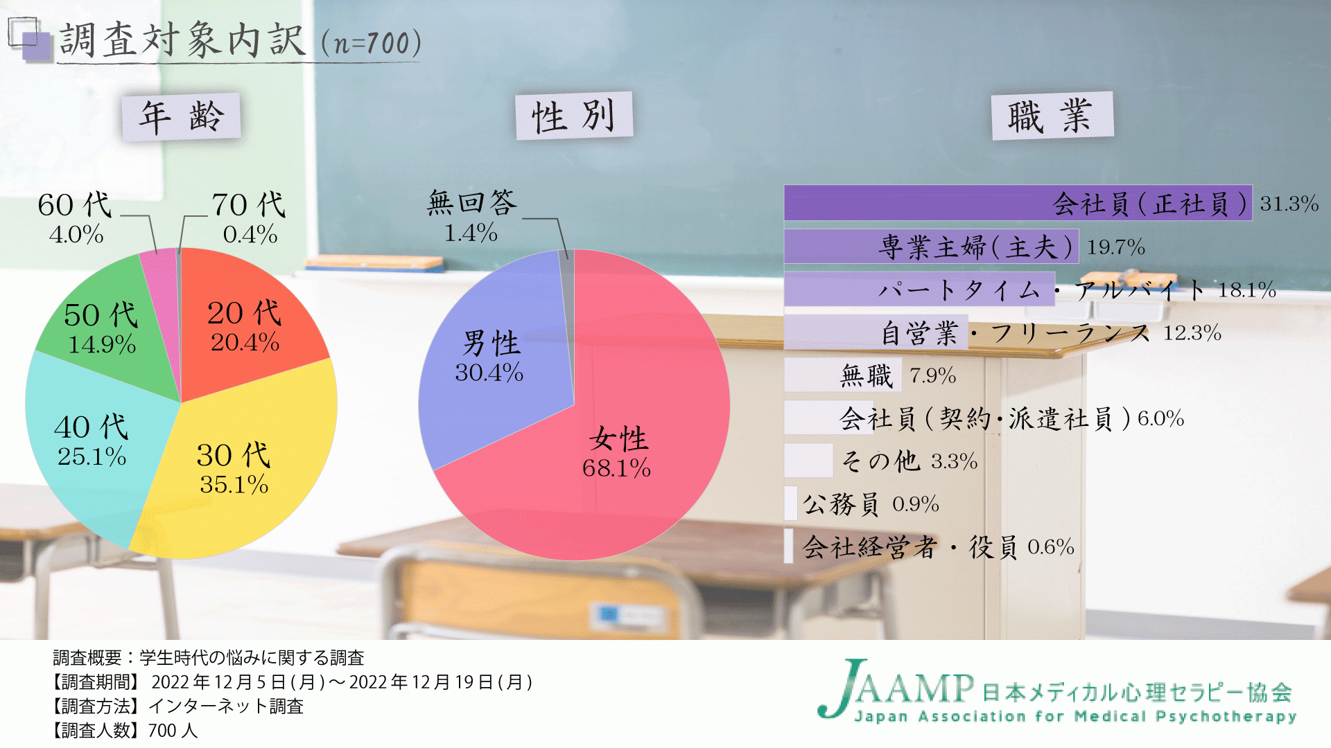 今回、日本メディカル心理セラピー協会(https://www.domap.net/)は、社会人経験のある20~70代を対象に「学生時代の悩み」に関する調査を実施しました。