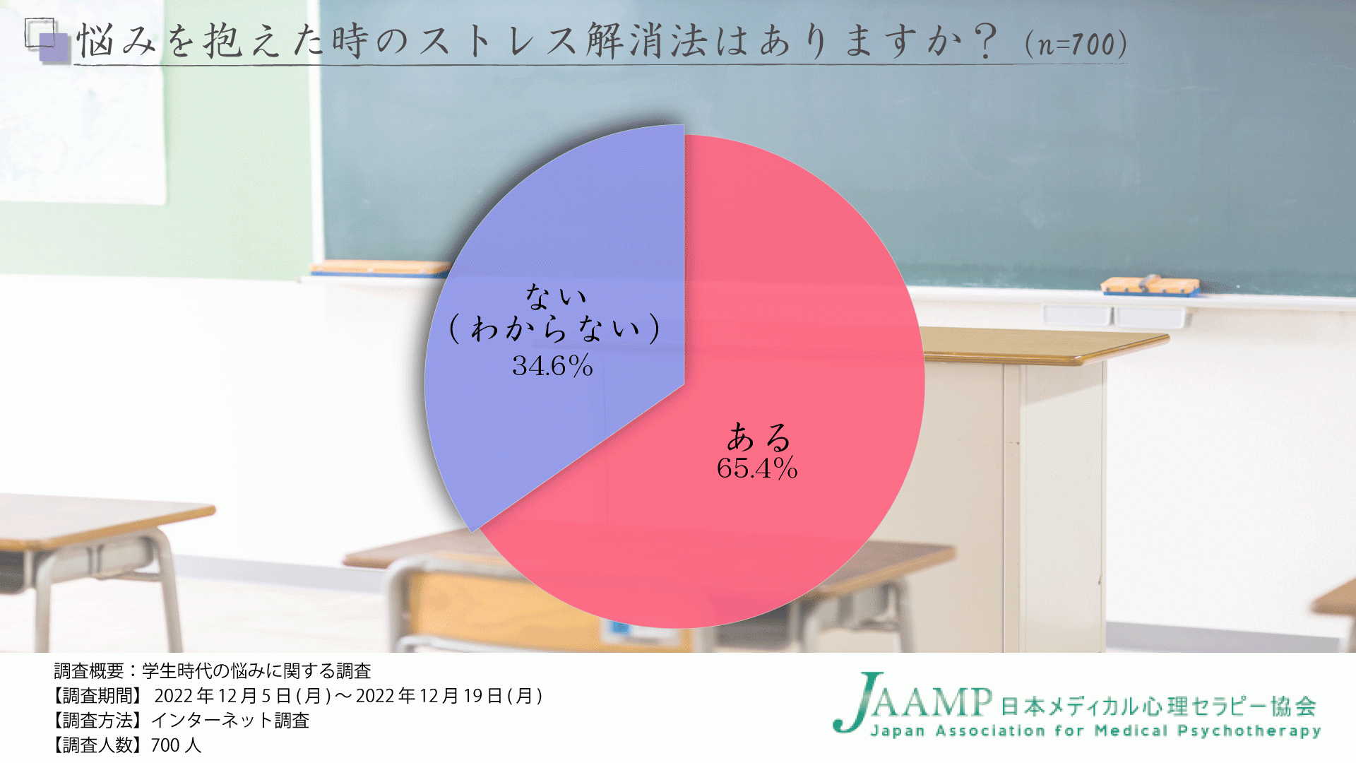 ストレス解消法が「ある」と回答した人が65.4%、「ない(わからない)」と回答した人が34.6%と、約3割の人が悩みを抱えた時の対処法をもっていないということでした。
