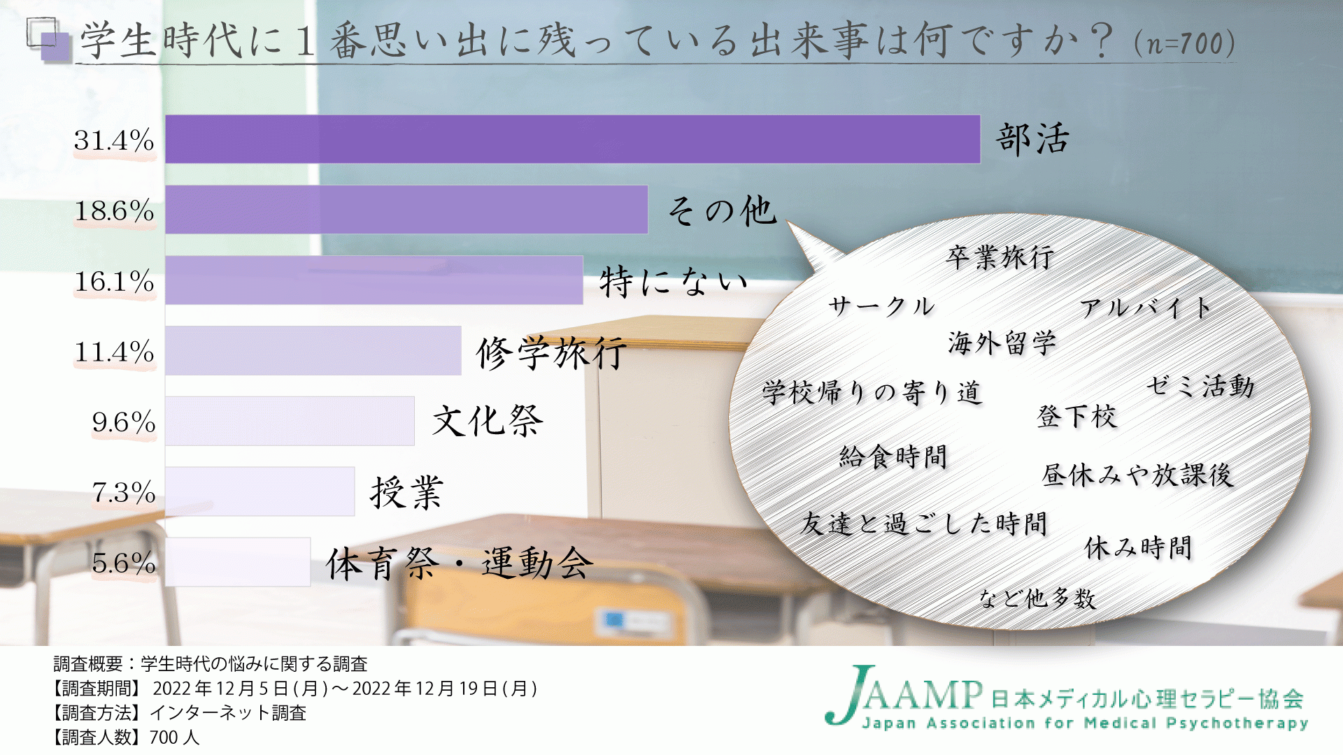 思い出に残っている学生時代の出来事を聞いたところ、3割の人が「部活」と回答しました。